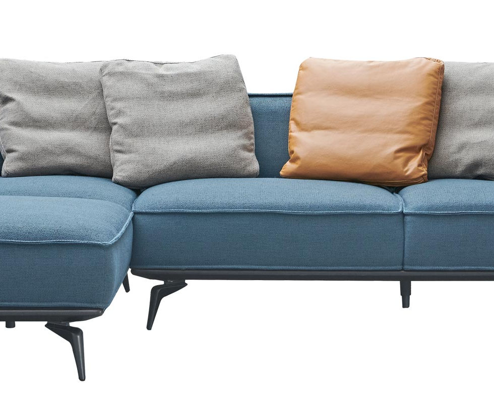 This contemporary sofa series blends structured lines with plush comfort. Available in standard and L-shaped sectional formats, each piece features smooth leatherette upholstery, clean piping detail, and sleek metal legs for a lifted modern look. The bold orange and checkered throw pillows add a dynamic pop of contrast, perfect for trendy, design-forward spaces.