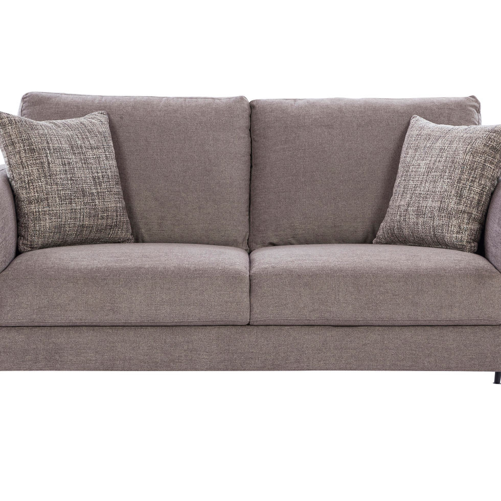 Designed for modern living, this charcoal-toned sofa offers clean lines, structured cushions, and understated elegance. Upholstered in soft, durable fabric with textured accent pillows, it delivers both comfort and visual depth. The slim black metal legs complete its contemporary look while maximizing floor space.